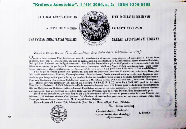 "Dyplom przyjęcia[1] do Pobożnego Stowarzyszenia Misyjnego założonego przez Sługę Bożego Wincentego Pallottiego pod opieką Dziewicy Maryi Królowej Apostołów