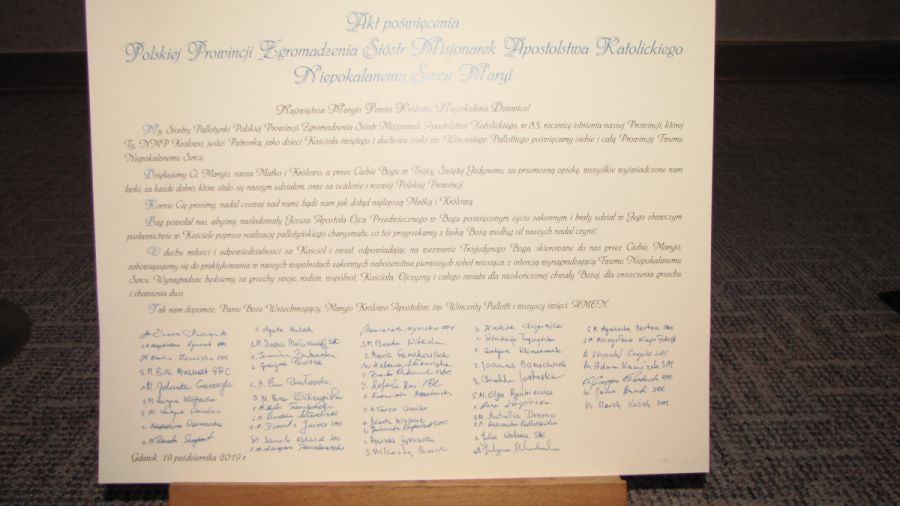 My, Siostry Pallotynki Polskiej Prowincji Zgromadzenia Sióstr Misjonarek Apostolstwa Katolickiego, w 85 rocznicę istnienia naszej Prowincji, której Ty NMP Królowo jesteś Patronką, jako dzieci Kościoła świętego i duchowe córki św. Wincentego Pallottiego, poświęcamy siebie i całą Prowincję Twemu Niepokalanemu Sercu.